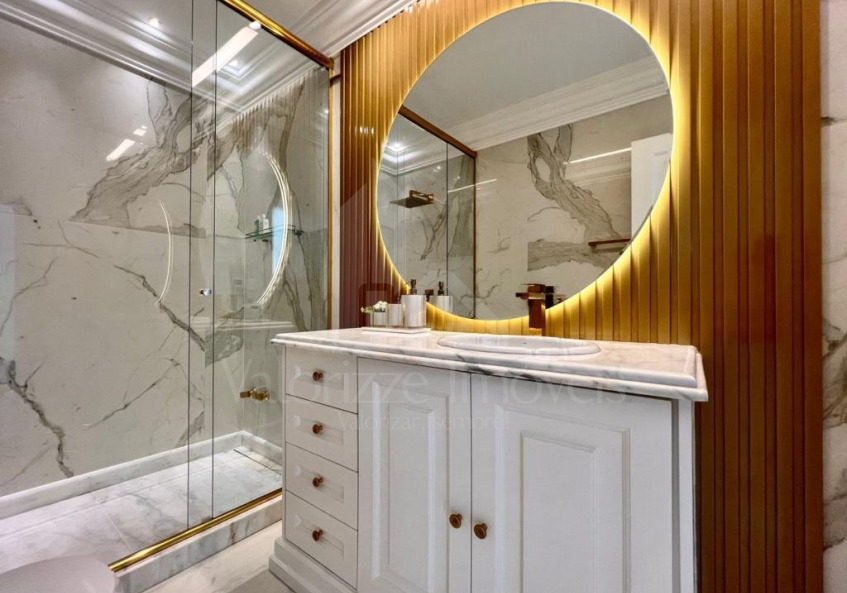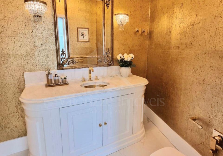 E falando em requinte, este imóvel encontra-se completamente mobiliado e decorado, sendo os móveis com puxadores banhado a ouro, 100% piso interno aquecido, 100% automatizada, espaço home-office, área de serviço com dispensa e lavabo.