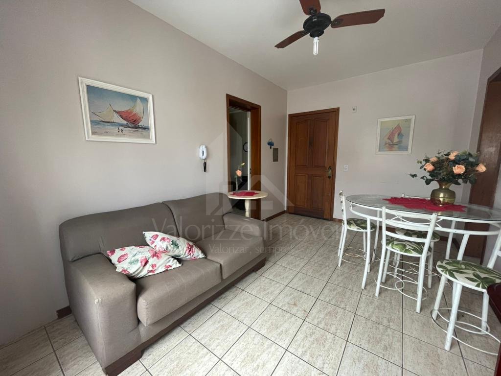 Apartamento semimobiliado de um dormitório, banho social, sala de estar e jantar integradas, cozinha independente com área de serviço e churrasqueira.