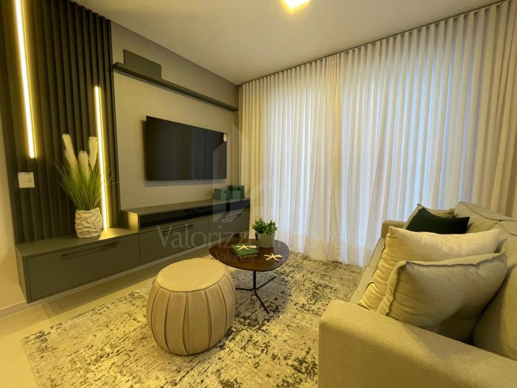 OFERTA: Apartamento composto por 02 dormitórios (sendo 01 suíte), banho social, cozinha no estilo americano com churrasqueira, área de serviço integrada, sala de estar e jantar, terraço em L , de frente com vista liberada, completamente mobiliado, decorado e equipado, orientação solar Leste/Sul (sol da manhã), novo e nunca habitado, 01 vaga de garagem. Edifício com infraestrutura completa, sendo 01 piscina de borda infinita com linda vista para a serra e lagoa, espaço gourmet externo, salão de festas, academia, sala de jogos e pet space, tudo isto no 15º andar com vista para o mar e toda a cidade. CONDIÇÃO ESPECIAL COM R$550.000,00 NO ATO E SALDO EM 48X.