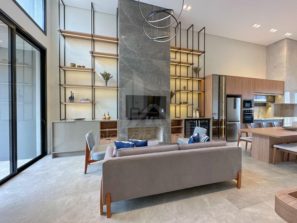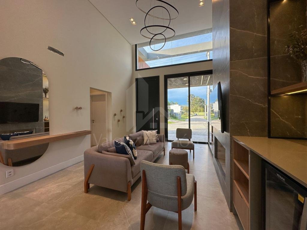 Linda casa em Condomínio, finamente mobiliada e decorada, 4 suítes, banho social, lareira, living em 2 ambientes, piscina em concreto, paisagismo, pé direito alto e aberturas externas em alumínio preto. Casa nova, nunca habitada.