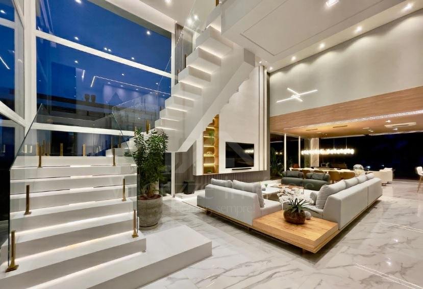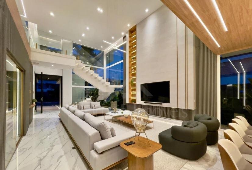 Localizado nos melhores terrenos do condomínio com 2 frente sendo 1 virada pra lagoa, são 5 dormitórios todos suítes, depedência de empregada completa, finamente mobiliada e decorada com alto padrão, piso em porcelanato importado, teto com gesso e MDF, 2 churrasqueiras, 2 cozinhas sendo uma estilo em ilha e outra separada, living com 4 ambientes, estar, jantar, sala de jogos, piscina de concreto, projeto com arquitetura moderna, linda vista do bosques e da lagoa, agende sua visita e solicita mais informações e detalhes.