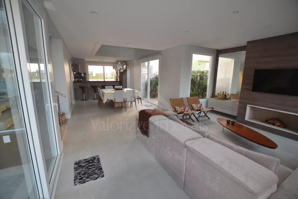 Sobrado com 4 dormitórios sendo todos suítes, lavabo, amplo living com 2 ambientes, piso em porcelanato, teto 100% em gesso, todo mobiliado e decorado, cozinha estilo americana, split em todos ambientes, área de serviço, deck em pedra imitando madeira, ofurô, abrigo para carros, localizado em frente a infra estrutura do condomínio.