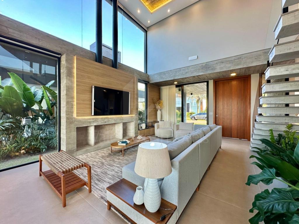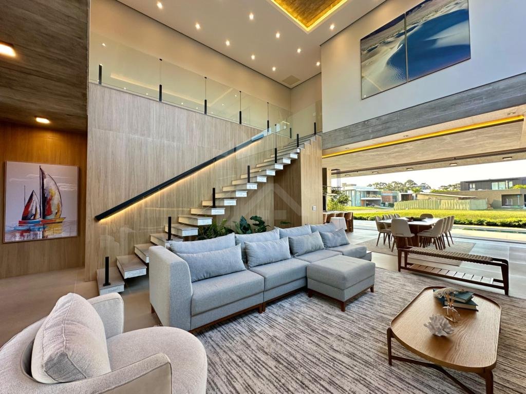 MAGNÍFICO sobrado em condomínio fechado, composto por 05 amplas suítes, living completamente integrado, cozinha com estilo americano, espaço de serviços separado, sala de estar com pé direito elevado e lareira, finamente mobiliado e decorado, varanda a beira da piscina comlinda vista para o lago, abrigo para 02 carros, jardinagem completa, arquitetura contemporânea e atemporal. Localizada em um lote estratégico dentro do condomínio, pertinho do clube house, piscinas e demais infraestruturas. CONSULTE condições de investimento!!