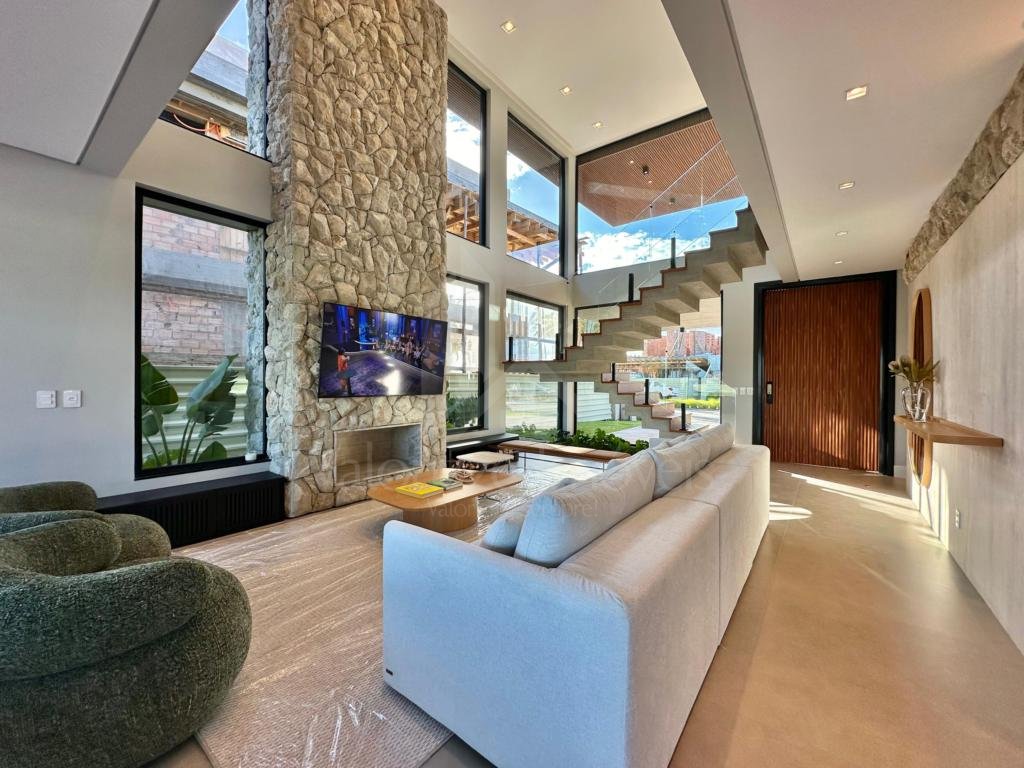 SOBRADO ESPETACULAR EM XANGRI-LÁ - Casa de cinema, 05 suítes, muito espaço interno, pé direito duplo na sala de estar com lareira revestida em pedras naturais, sala de jantar com integração total ao living, cozinha em estilo americano com espaço gourmet, varanda, piscina em concreto, deck avançando o lago, finamente mobiliada, decorada, equipada, climatizada e automatizada, repleta de requinte e bom gosto, arquitetura contemporânea brasileira com a medida certa de contraste entre a madeira, o concreto e as pedras naturais. Localizada em condomínio fechado de alto luxo, de frente para avenida principal e a beira lago com vista para a infraestrutura, com infraestrutura de lazer e esportes completa, alem de segurança 24h. Venha conhecer e se encantar com essa belíssima residência.