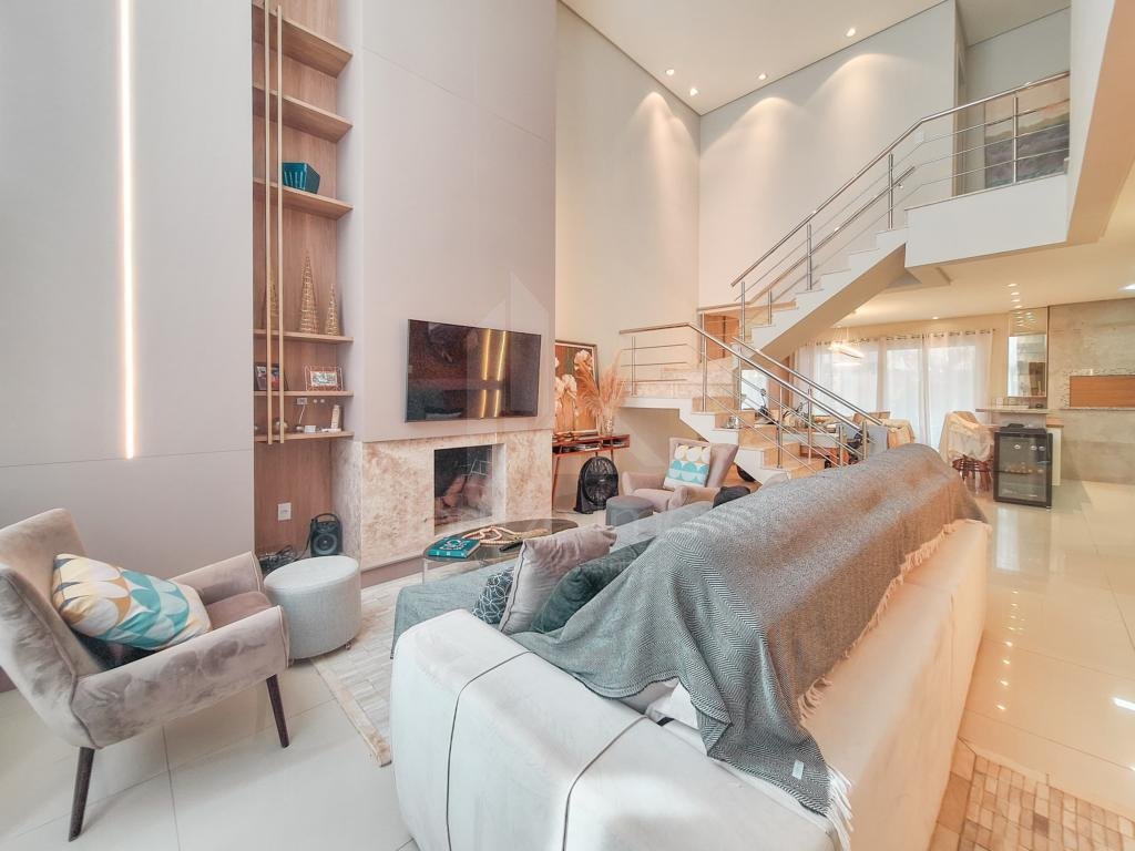 Pé Direito Duplo com Lareira: O living com pé direito duplo proporciona uma sensação de amplitude e grandiosidade, enquanto a lareira adiciona um toque de charme e aconchego, criando o ambiente perfeito para reunir amigos e familiares nas noites mais frias.